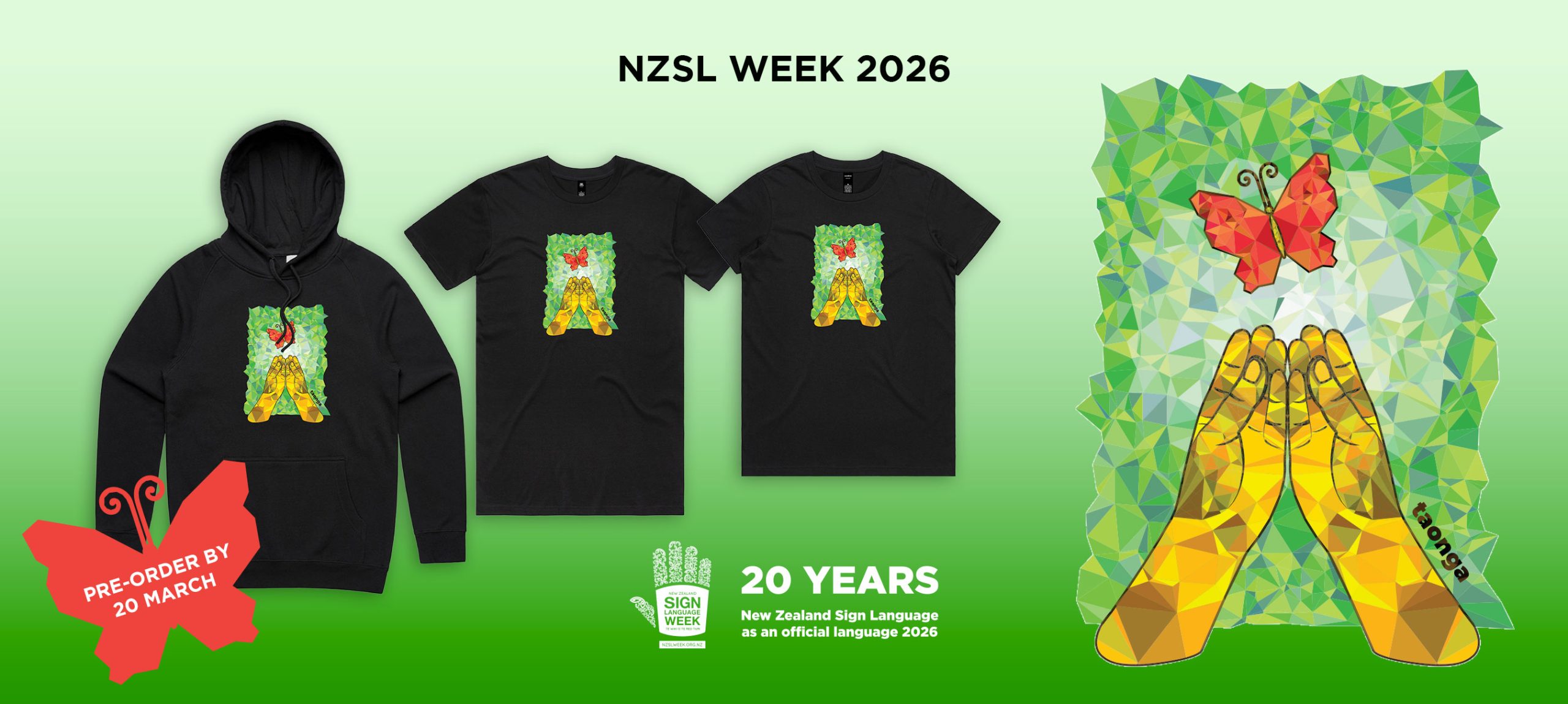 This year’s artwork features the winning design from Deaf artist Becky West. Her work reflects how she sees NZSL: clear, strong, full of light, and a true treasure. A language that offers access, confidence, identity, and freedom. A language that helps the Deaf community spread its wings and flourish.