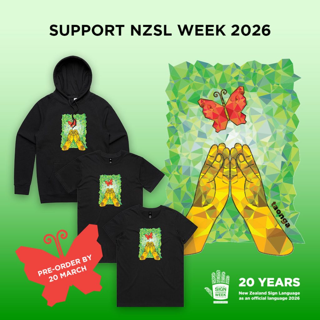 To mark this milestone, we are releasing limited NZSL Week merch designed by Becky West with this spirit in mind. Whether you are Deaf, hard of hearing, a learner, or an ally, you can wear your support anywhere. NZSL goes everywhere, and now your merch can too.